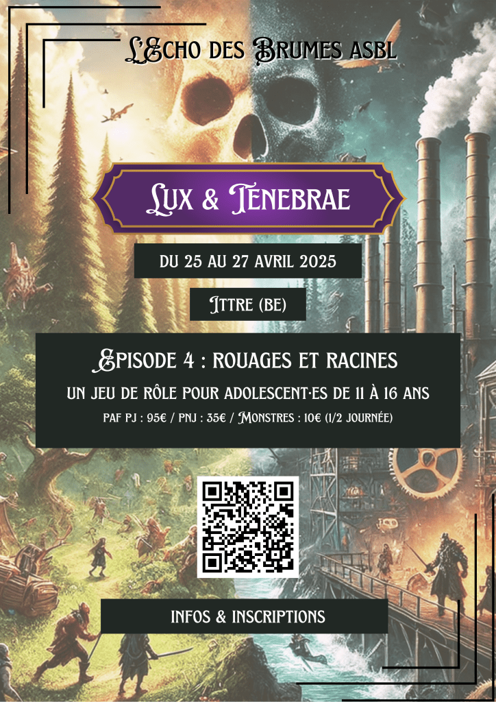 “ Tenebrae et Lux ” est un jeu de rôle grandeur nature de style médiéval fantastique, en campagne de plusieurs épisodes, prévu pour durer une soirée d’atelier pré-jeu et une journée et demie de jeu. Le jeu se veut être une initiation au jeu de rôle grandeur nature pour enfants et adolescents de 11 à 16 ans. Les intentions de l’équipe sont de présenter aux jeunes un évènement réfléchi à la rencontre de ce qu’est le GN et de ce vers quoi il évolue aujourd’hui dans les sphères connues. Certaines mécaniques de jeu seront utilisées comme mimer une action pour une compétence ou d’autres méta-techniques pour le combat mental et la simulation de la magie, …